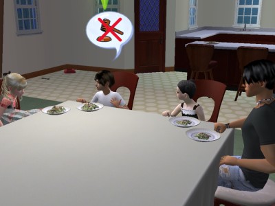 「文句言わずに食べなさい。お母さんの得意料理なんだから。おいしーでしょ」